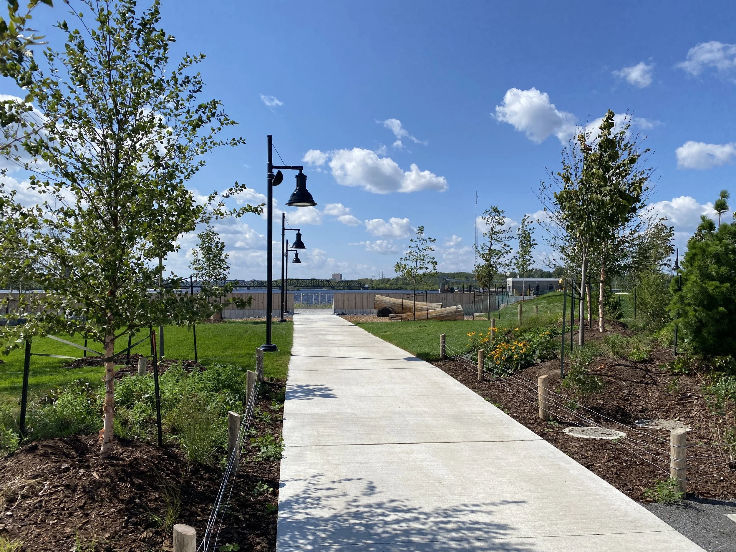 The naturalized plantings and organic forms of the park’s landscape combined with the hard-edged steel frame boardwalk reflect the site’s extensive history, beginning with the First Nations’ connection to nature and its proximity to the revered Chaudière Falls, and more recently the Colonial industrial lumber mills and logging along the Ottawa River. Through numerous design workshops and engagements – in addition to a multi-year consultation with numerous stakeholders including Algonquin Anishinaabe representatives – the concept of creating a space that established a sense of home and nostalgia for Algonquin community members, balanced with the need to create an inclusive space for all community members, was imperative. As such, a focus on using locally sourced, sustainable, or salvaged materials where feasible, as well as a native plant material palette, led the design. The use of native plant material creates a landscape reminiscent of pre-development natural lands along the river and through Algonquin territory, with recognizable seasonal interest, colours, and smells.